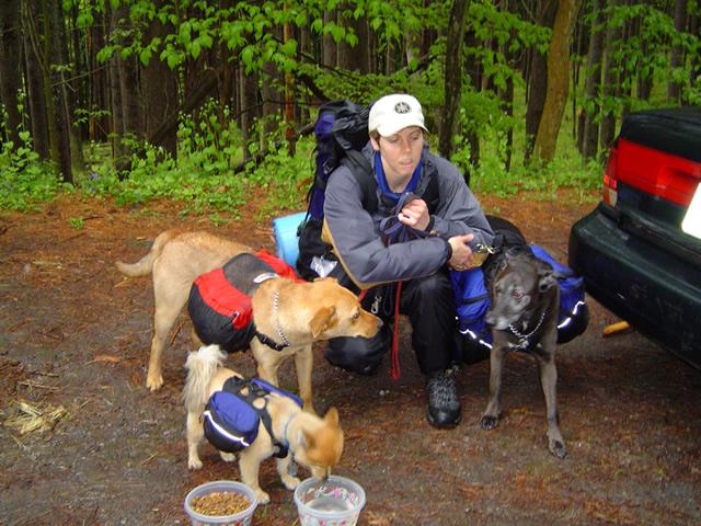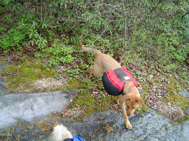 Have you ever seen a dog just after he’s gotten a bath where he runs around like a maniac? That was Duncan on our first break three miles in. This dog has enough energy for three dogs. When I took the dogs’ packs off, Charlie (5 years old) and Ackey (8 years old) sauntered around the camp area, got a drink from the spring and ate some food. Not Duncan. Duncan (1 year old) started ripping around at top speed, jumping in the spring and through the stream, bounding off rocks, grabbing twigs and small limbs and dragging them along. At one point he was pouncing on a rock and then throwing it in the air.