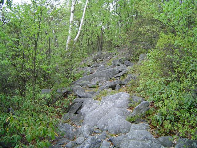 Got to the trail about 11:30 after a three hour drive. Started out a little rough. First, about 20 paces into the hike, Charlie tripped, rolled, got his foot caught in the harness of his backpack, and then rolled another 20 feet down the hill. Second, about a half mile later we came to a 30 foot wide stream crossing with no hope of hopping across it on rocks. I tried it barefoot but had problems staying vertical after about three steps because the rocky bottom was so slippery. Put my shoes and socks back on, trudged across the stream, and made a mental note to NEVER leave my Tevas behind again.