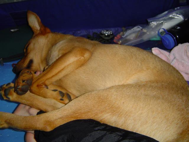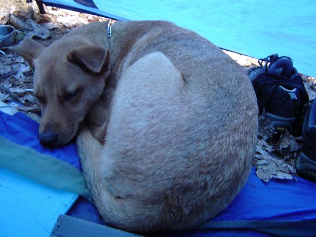 Duncan doesn’t like going into the tent so he sleeps half-way in
